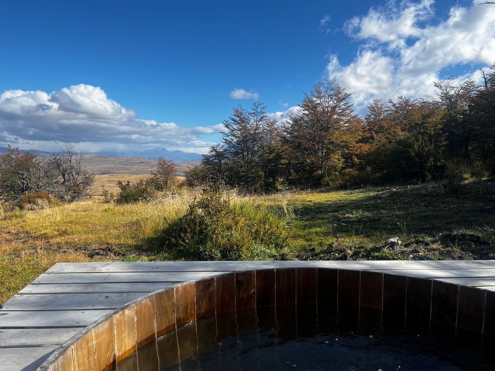 "Outdoor hot tub on a private villa terrace at Awasi Patagonia in Chile, crafted from local lenga and ñirre wood, offering sweeping views of Torres del Paine and Lake Sarmiento. The hot tub blends luxury with nature, surrounded by forest and the lodge’s private reserve setting.